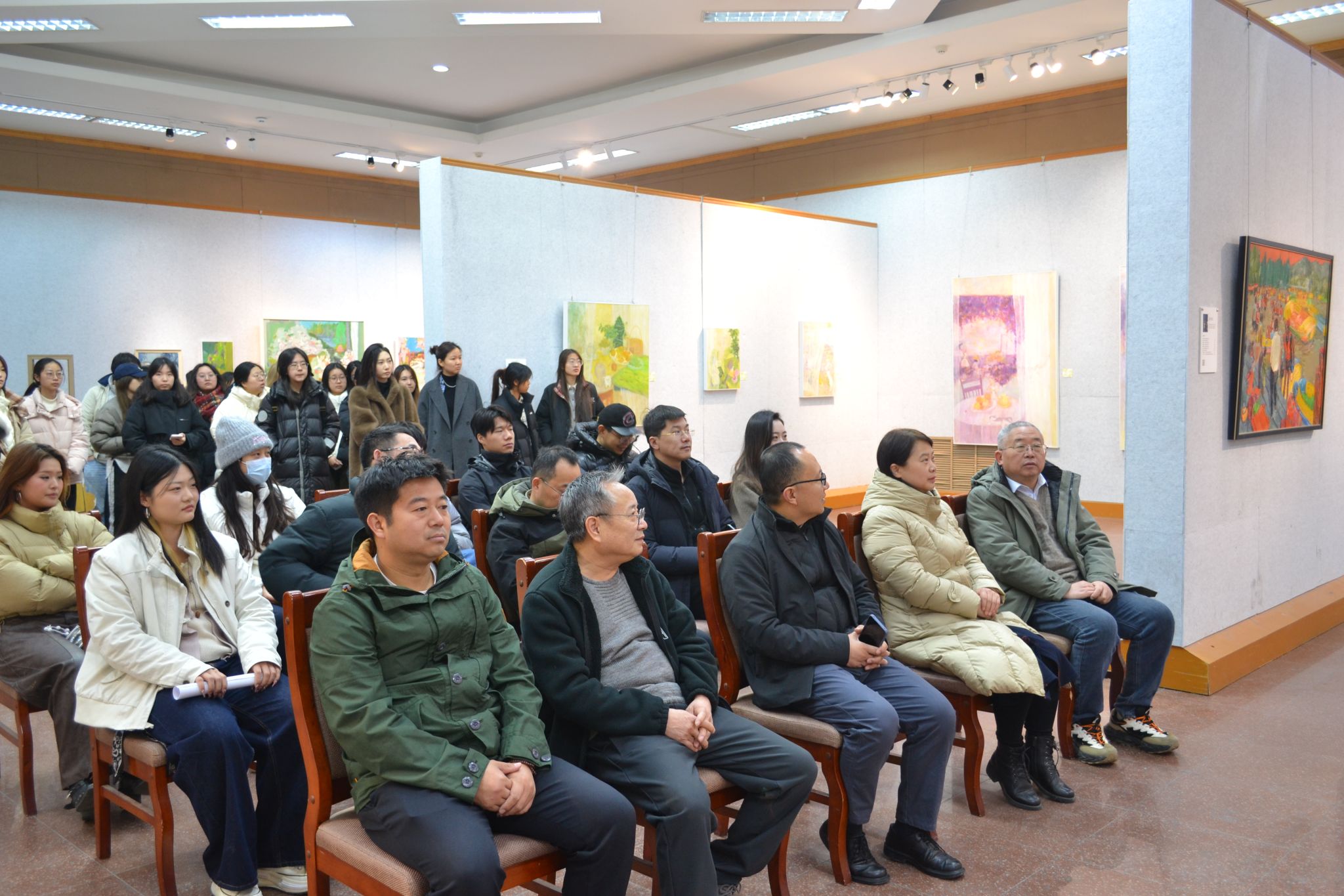 展览现场,学院领导与硕士生导师组逐一品鉴毕业作品,在画作前驻足端详、交流点评,对同学们的创作水准与学术思考给予充分肯定。现场氛围热烈而浓厚,艺术探讨与思想交流此起彼伏。展出作品风格鲜明、题材多元,既有对自然山川的诗意抒写,也有对当代社会细腻情感的深刻捕捉;从厚重的油彩肌理到灵动的水色晕染,同学们以扎实的专业技法与真挚的情感表达,呈现出丰富多样的艺术面貌。