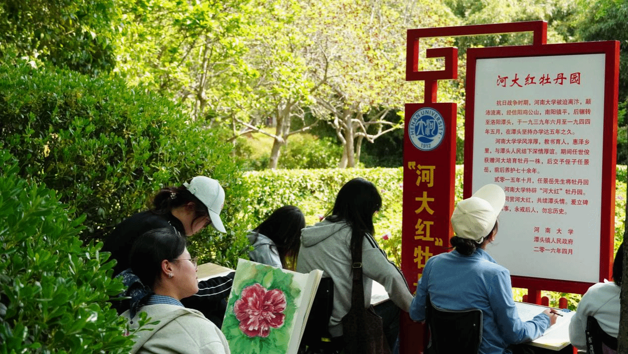 牡丹园中的“河大红”,承载着抗战时期河南大学南迁潭头、烽火办学的记忆。团员们驻足观赏牡丹盛放的姿态,聆听牡丹背后承载的河大记忆与家国情怀,深刻理解“河大红”牡丹所象征的坚韧不拔、向阳而生的精神内涵,将校史底蕴与牡丹风骨融入创作灵感。