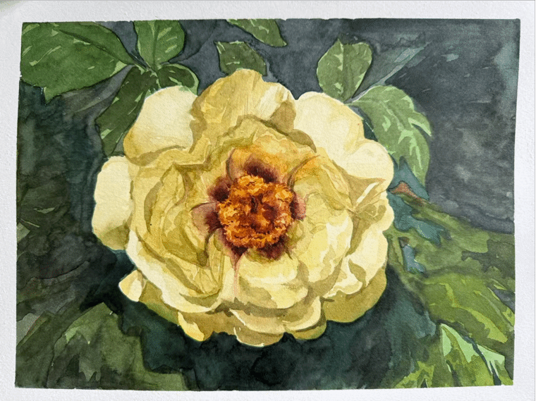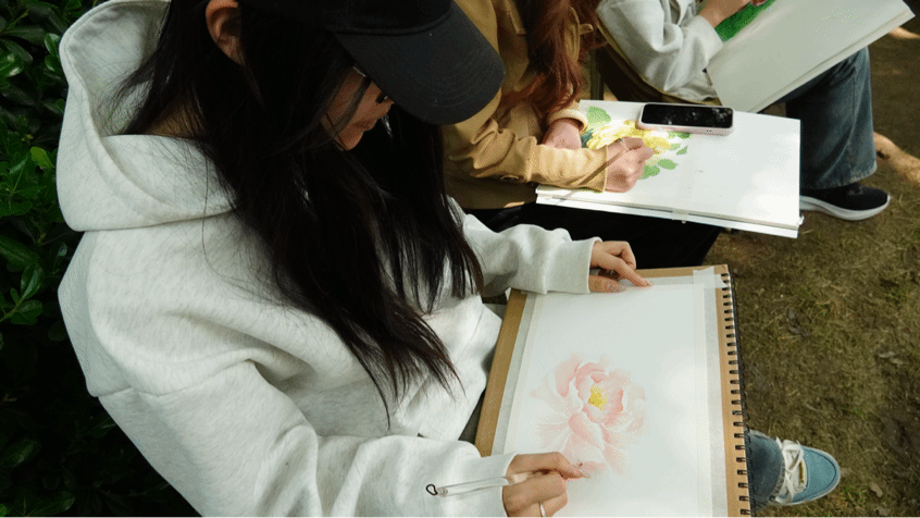 4月11日下午,美术学院2025级本科生团员齐聚河南大学明伦校区牡丹园,在朋辈辅导员杨田田的指导下,开展了“承河大风骨 赏烽火牡丹”主题团日活动。大家以笔为媒、以画传情,在色彩晕染间回望校史、感悟河大精神,将园中盛放的“河大红”牡丹之美、风骨之韵定格于画纸之上。