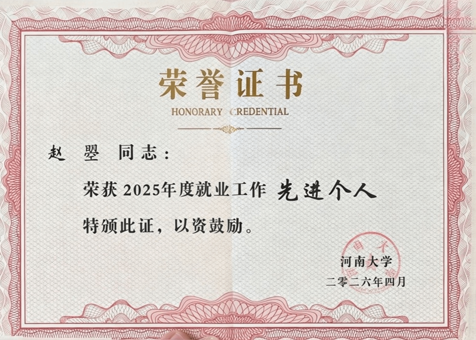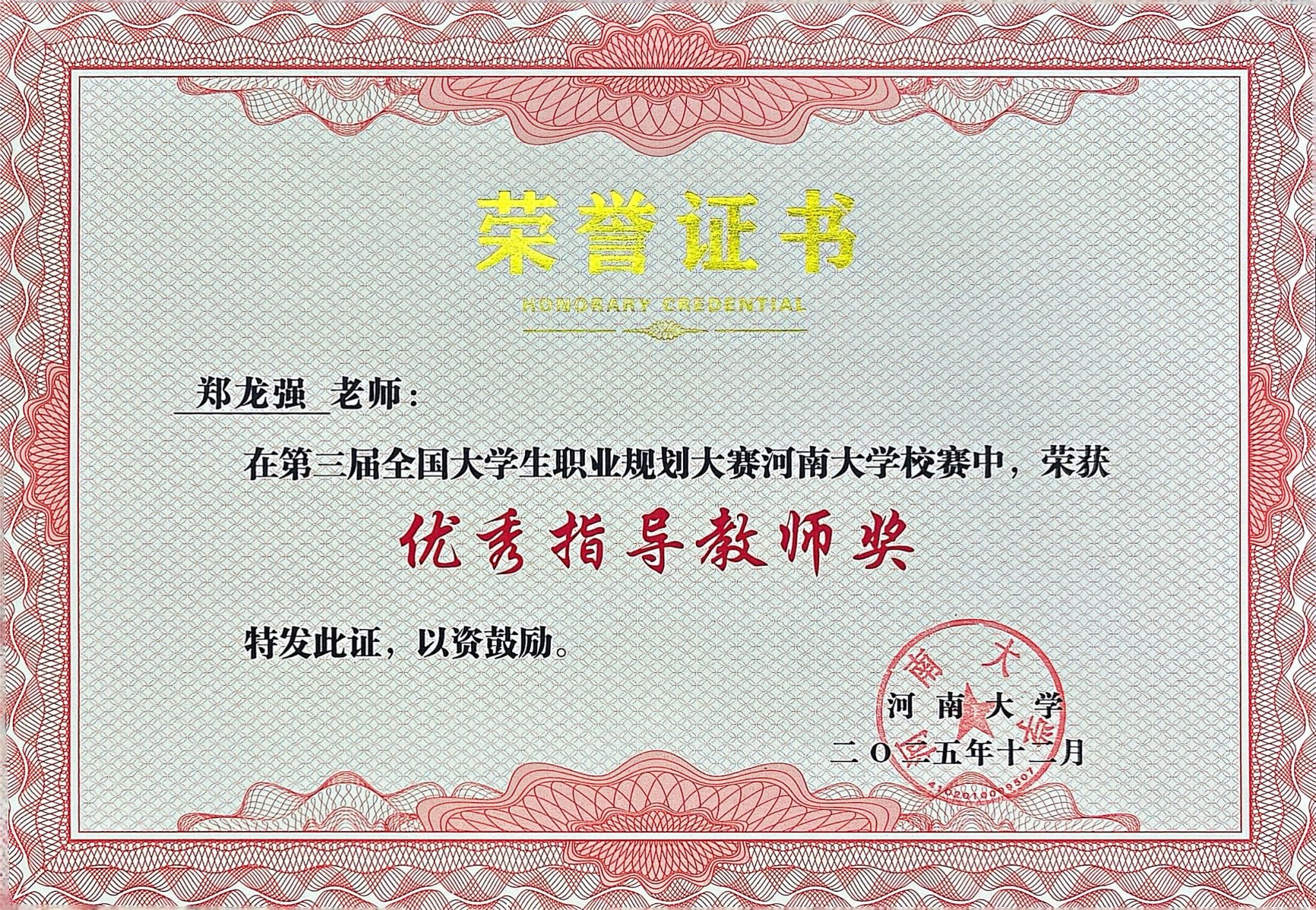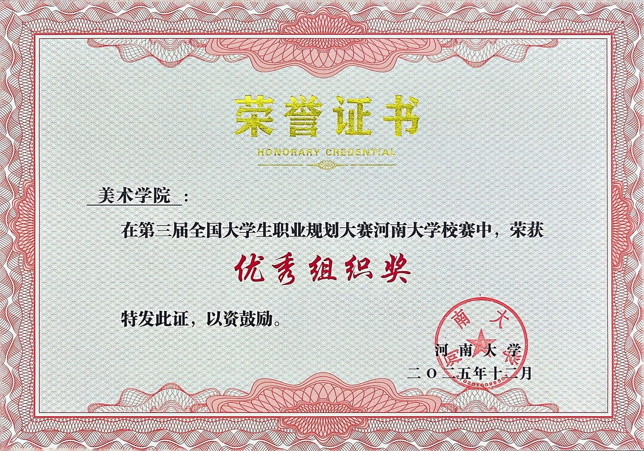 此次表彰中,我院收获了多项荣誉,其中,赵曌老师凭借认真负责的工作态度、扎实专业的工作能力,被评为“河南大学2025年度就业工作先进个人”;在第三届全国大学生职业生涯规划大赛河南大学校赛中,我院因组织有序、成效显著,荣获“优秀组织奖”,郑龙强、吕汶锦两位老师凭借专业的指导水平和悉心的培育付出,获评“优秀指导教师奖”;周青老师主持的“艺启未来”工作室获批学校第四批就业指导咨询室,为我院进一步强化就业指导服务、助力毕业生成长成才搭建了新平台。