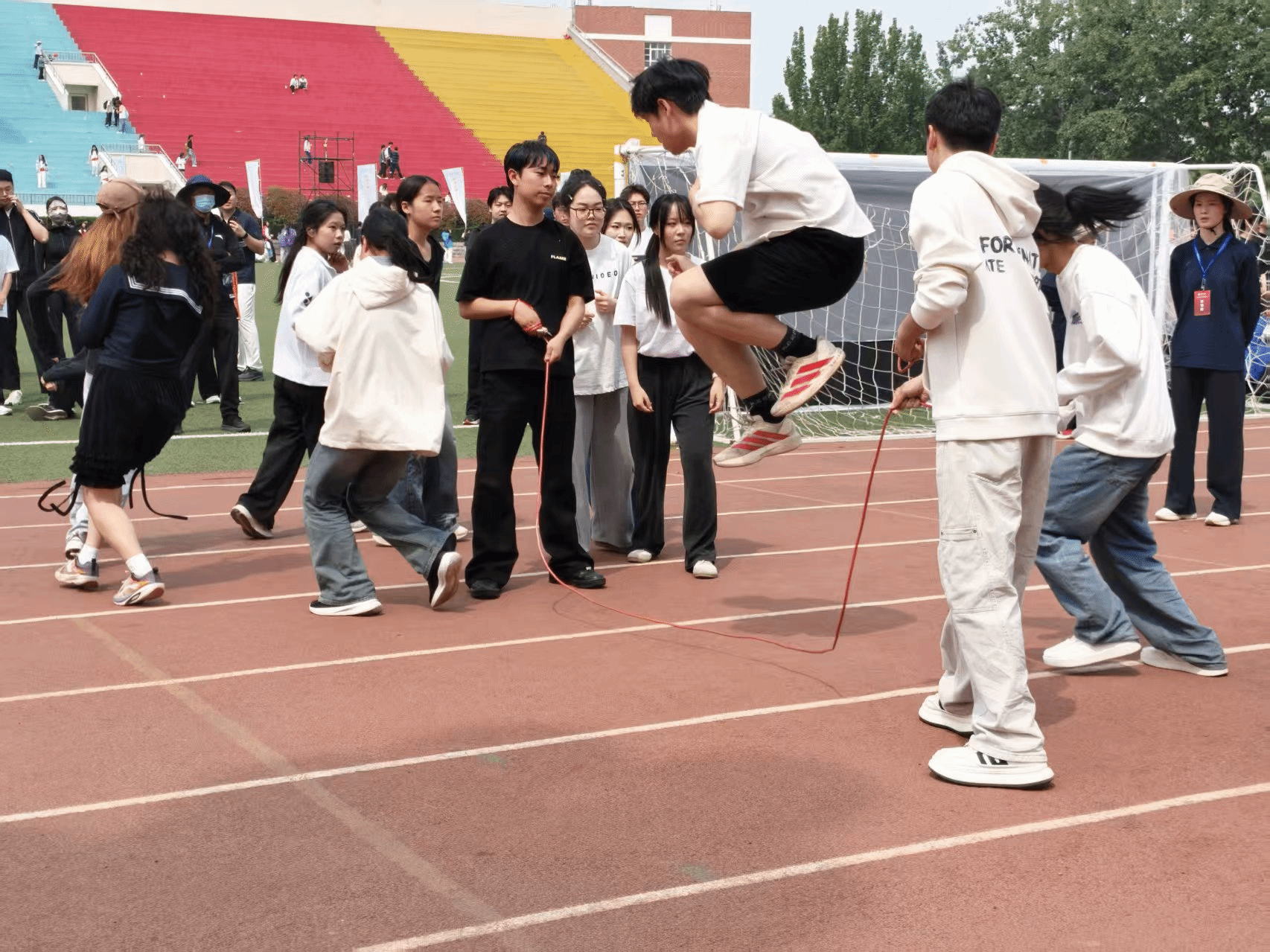 绳影翻飞逐春风,同心聚力绽锋芒。集体项目的赛场上,美术学院学子身姿轻盈,默契相随,将团队的力量展现的淋漓尽致。摇绳者稳控节奏,跳跃者步调齐整,起落之间尽显默契从容。每一次腾空跃起,都是速度与默契的完美碰撞;每一轮连贯起落,都是信念与团结的深情回响。单人赛场上,他们亦如疾风般驰骋,以矫健身姿突破自我,在速度与耐力的较量中独绽光芒。动的身影,是美院人同心同行的热忱;整齐划一的节拍,书写着并肩向前的昂扬篇章,尽显集体风采与蓬勃力量。