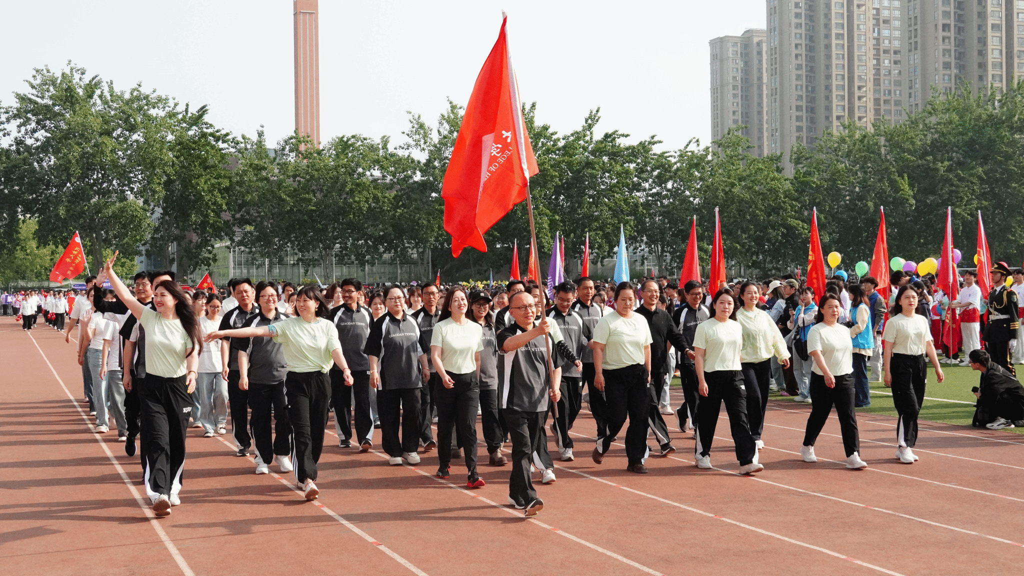 暖阳之下,彩旗猎猎。美术学院方阵迈着铿锵有力的步伐,昂首阔步、意气风发地向主席台走来。简约利落的服饰在春光中舒展,恰似灵动的青春笔触,为春日赛场勾勒出独属于美术学院的明亮色彩。呐喊声、口号声此起彼伏,师生们身姿挺拔、步履铿锵,将“笃行致远,艺绽芳华”的信念,融入每一步奋进的征程。