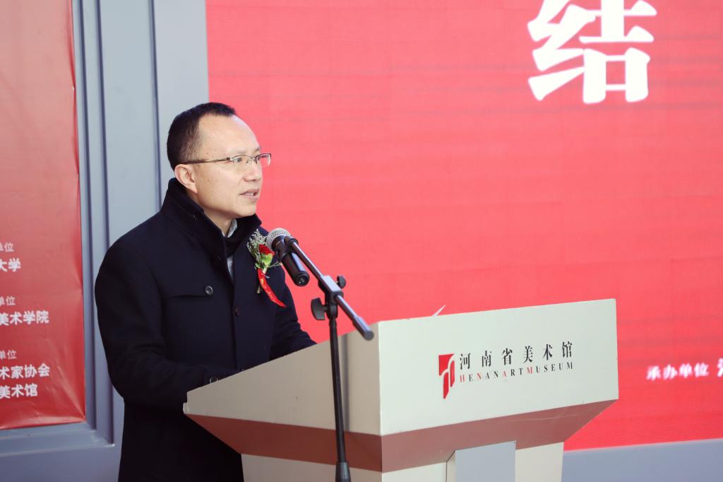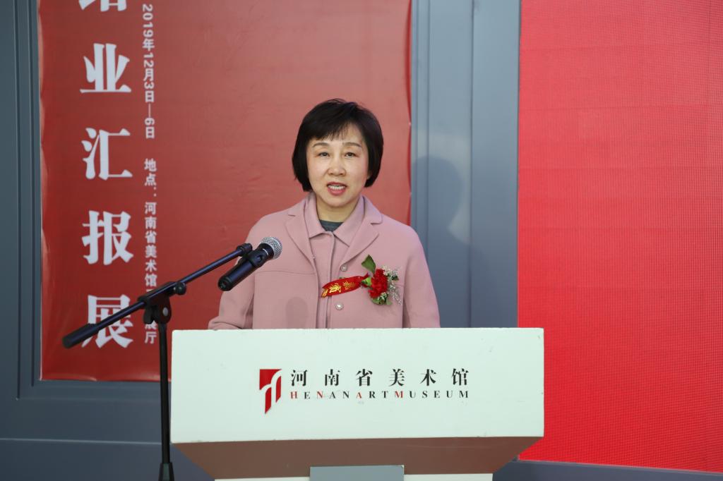 开幕式伊始,沈洁霞致欢迎辞,她代表河南大学党政领导班子对展览的举办表示热烈祝贺,对拨冗出席开幕仪式的各位领导、专家表示热烈欢迎,对长期以来关心支持河南大学美术教育事业发展的专家、朋友表示衷心感谢。她指出,河南大学于1949年开设美术专业,是河南省最早开设高等美术教育的院校,至今已培养出众多具有突出成就的艺术家。沈洁霞表示,2019年国家艺术基金项目花落河南大学,可谓适逢其时、锦上添花。这既是对河南大学美术教育的肯定,也是对美术学院师生的激励与鞭策,希望美术学院以此次国家艺术基金人才培养资助项目为契机,进一步聚集人才,聚焦人才培养,创作优秀作品,加强学术交流,广交四海朋友。不忘初心,牢记使命,为河南省乃至全国高等美术教育做出更大贡献。