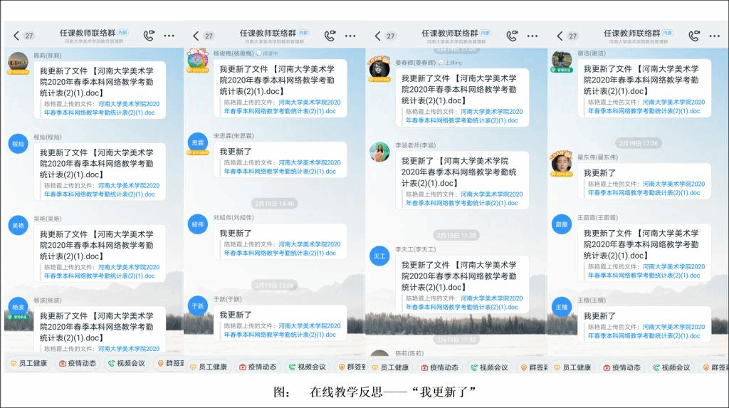老师们用12天的时间攻坚克难,从零开始学习掌握在线教育技术,积极探索雨课堂、智慧树、钉钉、腾讯会议等网络教学平台授课方法。大家在新建的钉钉任课教师群、美术学院雨课堂培训群中畅所欲言,疑问与困惑伴随着答疑、研讨与彼此鼓励,线上教研活动就这样持续不断的进行着。经过近两周的积极准备,美术学院新学期课程全部正常开播。在困难与问题面前,学院教师团队的选择是砥砺前行。