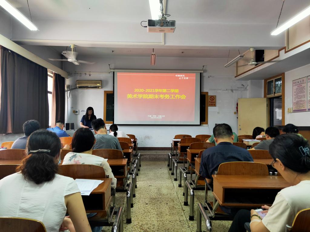 . 6月30日上午,美术学院在艺术楼二楼电教室召开2020-2021学年第二学期期末考务工作会,全体监考教师及考务人员参加会议,会议由副院长蔡玉硕主持。 会上,蔡玉硕副院长结合《河南大学考试工作管理条例》(校发[2018]1号文件),围绕河南大学监考“十做到”,以及河南大学及美术学院2020-2021学年第二学期期末考试巡考工作安排,重申考风考纪,强调监考规范、考场规则、违纪和作弊认定等事项,要求监考老师认真履行考试职责,严明考试纪律,确保考试顺利进行,给考生创造一个公平、公正的考试环境。教务办陈艳霞老师就考试流程、违纪处罚等具体事项对全体监考人员进行了全面培训,并要求每位监考员严格遵守考试实施细则,确保考试工作平稳有序、顺利开展。
