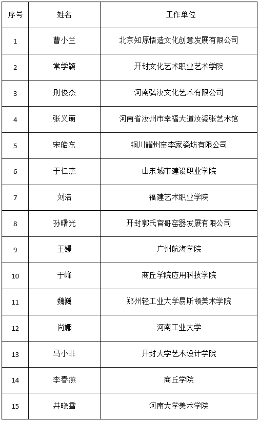 《宋代官窑制瓷技艺人才培养》项目录取学员名单