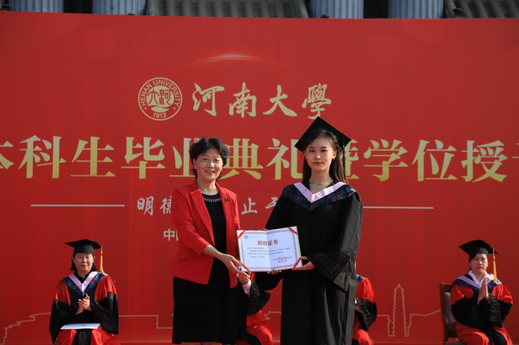 典礼在庄严的国歌声中拉开序幕。刘波代表河南大学教育发展基金会,接受美术学院2022届毕业生爱心捐款,并颁发“捐赠证书”。她对同学们积极响应“感恩母校·微爱助力——毕业季一元捐”活动表示赞许,并为全体毕业生送上了美好祝福。副院长蔡玉硕宣读《关于授予美术学院2022届200名本科毕业生学士学位的决定》,副院长陈旭宣读《美术学院荣获河南大学2022年优秀应届毕业生名单》。美术学院学位评定委员会主席、院长席卫权依次为学位获得者授予学位,援正流苏,并合影留念。
