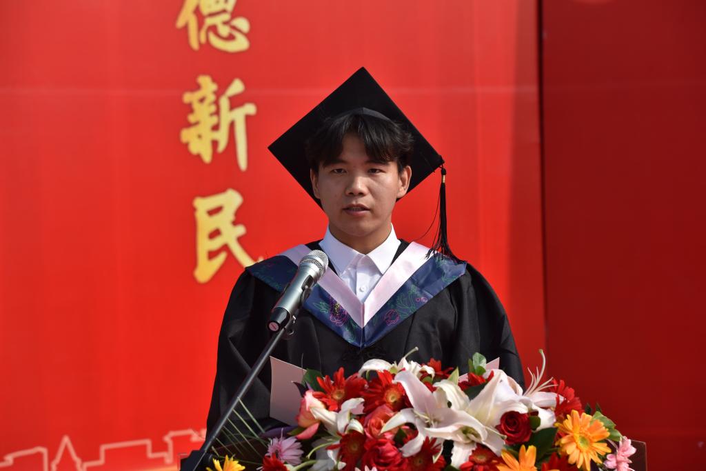 贾卓燊代表全体毕业生,向一直以来悉心教导、诲人不倦的老师们表达衷心的感谢。他与在场全体毕业生共勉,作为学院培养的青年学子,要始终坚定理想信念,用奋斗的青春成就未来,在青春的赛道上跑出更好成绩。