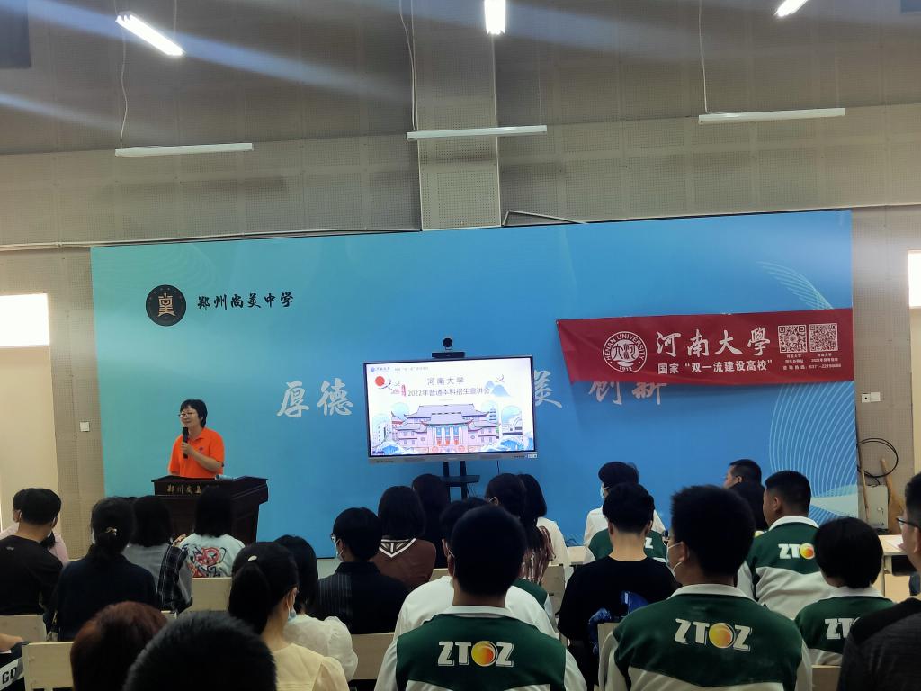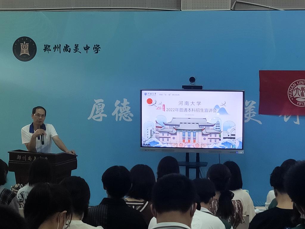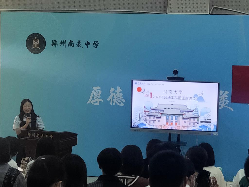 郑州市第一〇六高级中学是河南大学的优质生源基地。周青首先对学校近年来持续为河南大学输送优质毕业生表示感谢,同时强调,适值河南大学建校110周年之际,欢迎更多优秀学子选择报考河南大学这所百年学府,为实现人生梦想插上翅膀。现场播放了《河南大学2022年本科招生宣传片》,帮助前来咨询的家长和考生直观感受国家“双一流”建设高校——河南大学的风采与魅力。贾涛详细解读了河南大学的人才培养现状,从一流专业、一流课程、教学名师等方面,宣传了河南大学的办学优势和特色。在郑州尚美中学,由我校招生办公室制作的《2022年普通本科报考指南》等宣传资料受到了热烈欢迎,翟俊卿老师、郑龙强老师也就考生家长关心的志愿填报等问题进行了解答,吉炫竹则分享了在河南大学求学的收获和感悟,现场氛围热烈,效果良好。