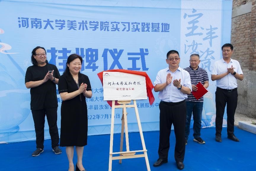 7月15日,美术学院本科生实习实践基地挂牌仪式在宝丰县汝瓷研究所举行,美术学院党委书记杨江涛、河南大学中国陶瓷研究院长王洪伟、视觉传达设计系主任洪涛、教务办公室翟俊卿及宝丰县委常委、宣传部长、副县长王浩,平顶山市说唱文化(宝丰)生态保护发展中心主任申红霞参加了仪式。仪式由宝丰县委常委、宣传部长、副县长王浩主持。 杨江涛在致辞时说,美术学院一直以来注重加强对本科学生实习实践技能的训练,全面提高教育质量,培养适应我国改革开放和现代化建设事业需要的高级专门人才。此次美术学院本科生实习实践基地落地宝丰县汝瓷研究所,我们将通过艺术家驻场创作、高层次的全国性、国际性宝丰汝窑学术研讨活动、汝窑文创设计等把文化传承与立德树人紧密结合起来,使河南大学美术学院本科、硕士、博士学生的教学实践真正的扎根中原大地,为汝窑陶瓷产业的繁荣发展不断注入新的动力。 申红霞在致辞中对河南大学支持宝丰汝窑陶瓷产业的发展表示感谢,宝丰县汝窑瓷业发展中心将以此为契机,积极为河南大学学生实习实践搭建好平台,借高校人才优势,加强合作交流,碰撞出更多艺术创意,为宝丰“四强县”建设贡献力量,为河南文旅融合注入新动能。 仪式上,杨江涛、申红霞共同为河南大学美术学院实习实践基地挂牌。