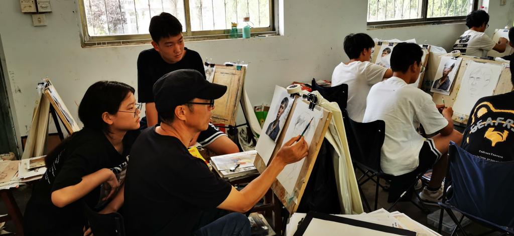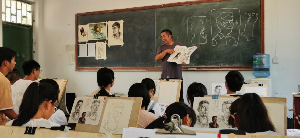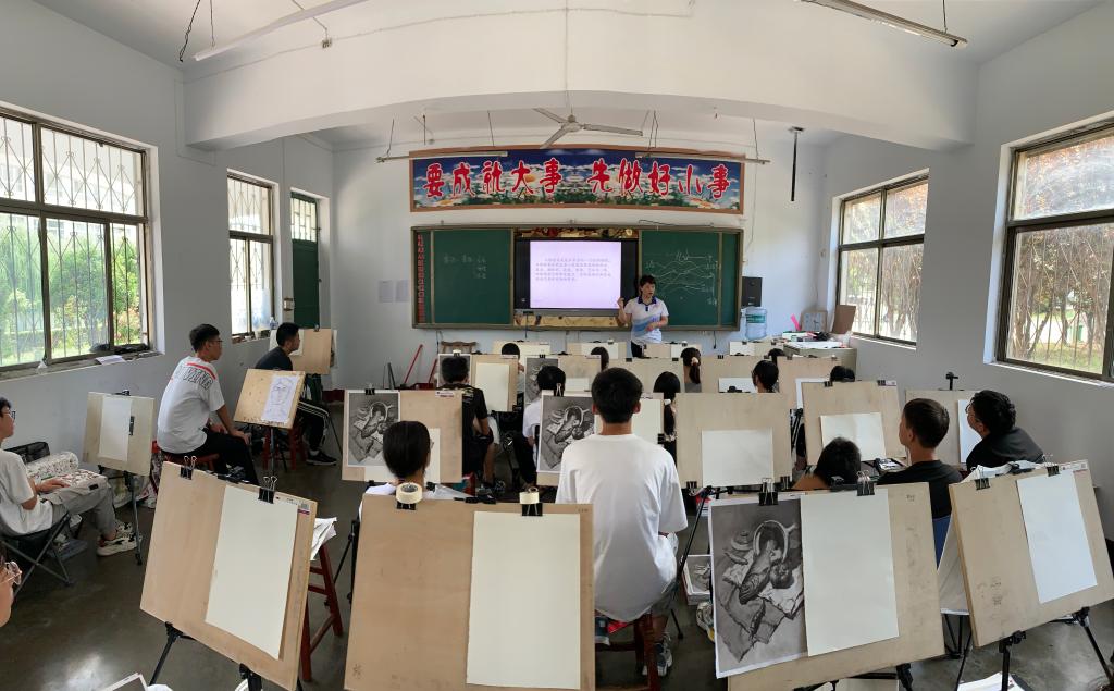 7月15日上午,河南大学潭头附中、荆紫关附中第八期暑期艺术培训班开班仪式举行,肖海英老师在开班仪式上作为授课教师代表发言。随后,几位老师投入到紧张的教学工作中,为来自河南大学潭头附中、荆紫关附中的51名学生进行为期15天的高考培训。本期培训紧跟美术高考科目,设置了素描、速写、色彩等实用课程。素描课程,培养学生对造型的审美感受、观察方法、理解能力和艺术表现力;速写课程,训练学生对人物、景物、人物动态规律、对刻画对象的观察概括和准确的表达能力;色彩课程,训练学生对色彩基础知识的掌握、色彩感觉的敏锐、色彩关系把握和艺术表现力。肖海英老师表示,在河南大学110周年校庆之年,能够重走抗战办学路,为潭头附中、荆紫关附中学生提供艺术培训,这是我们这一代“河大人”回馈当地人民深情厚谊的体现,也加深了自己对“百折不挠、自强不息”河大精神的理解。全体授课老师都能克服困难,全情投入,针对学生的具体情况调整教学方案,深入浅出地讲解,对每位同学的绘画作品逐一示范教学。白天七个小时重点学习素描、色彩,晚上突破速写。同学们通过大量的练习,专业水平有了明显的进步,这让我们感到十分欣慰,希望他们未来能够不断提高专业水平,考上理想的大学,实现人生梦想。