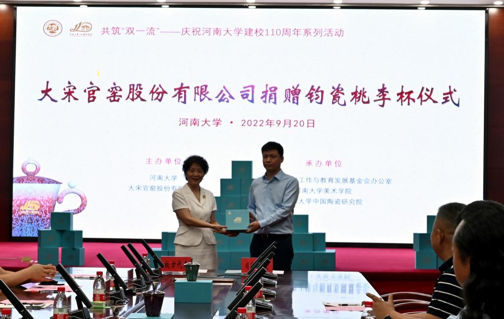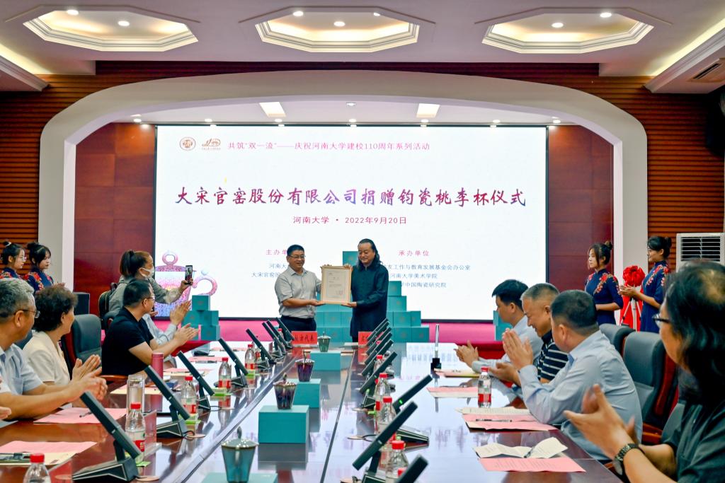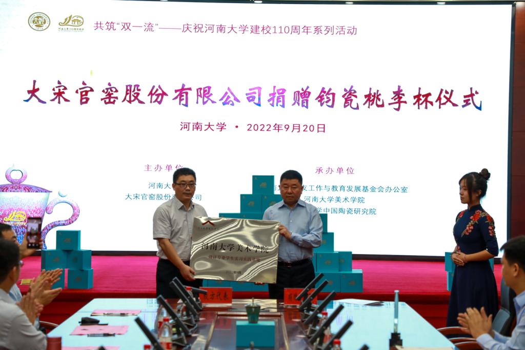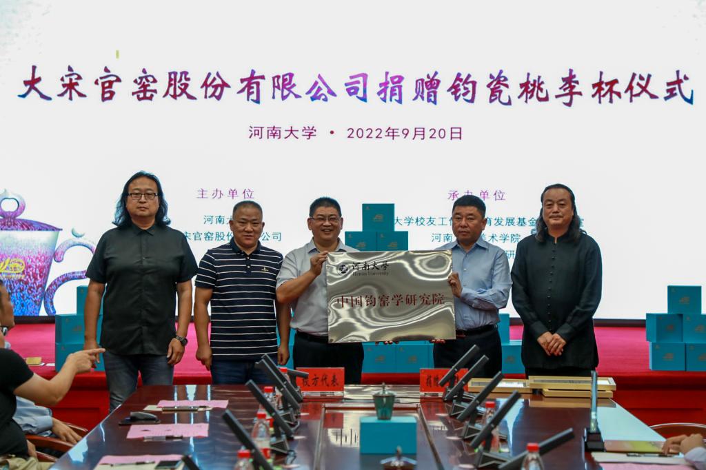 9月20日上午,大宋官窑股份有限公司向河南大学110周年校庆捐赠钧瓷“桃李杯”仪式在明伦校区小礼堂举行。河南大学党委书记卢克平,大宋官窑股份有限公司董事长苗峰伟、艺术总监张怀强、副总经理黄波,河南大学教育发展基金会秘书长刘波、河南大学教务处处长张向东出席仪式。河南大学教育发展基金会副秘书长唐胜,美术学院党委书记杨江涛、院长席卫权、党委副书记周青、副院长蔡玉硕、副院长陈旭、河南大学中国陶瓷研究院院长王洪伟、美术学院视传系主任洪涛参加活动。捐赠仪式由美术学院院长席卫权主持。 优秀校友、钧瓷“桃李杯”设计师张怀强讲述了设计创作理念和烧制过程。刘波代表学校接受捐赠并向大宋官窑股份有限公司颁发捐赠证书及纪念杯。美术学院党委书记杨江涛向张怀强颁发美术学院讲座教授证书。 张向东代表河南大学,苗峰伟代表大宋官窑股份有限公司共同签订了“本科学生实习实践教育基地建设合作协议书”并授牌。王洪伟和苗峰伟分别代表河南大学中国陶瓷研究院、大宋官窑股份有限公司签订了共建“中国钧窑学研究院”的战略合作协议。杨江涛为中国钧窑学研究院院长王洪伟、苗峰伟,副院长洪涛、张怀强依次颁发聘书并授牌。 王洪伟表示,河南大学学术团队多年来对“钧窑学”开展了系列的学术理论研究,前期牵头河南大学与禹州市人民政府签订了共建“中国钧窑学研究院”战略合作的意向协议。河南大学中国陶瓷研究院与大宋官窑股份有限公司通过构建钧窑学学术平台,有望进一步推动钧窑学落地生根、开花结果。 苗峰伟表示,本次捐赠的2000套“桃李杯”钧窑作品,是以河南大学110周年校庆主题创意设计的。河南大学根植中原沃土,培养的“铁塔牌”学子犹如钧窑烧制中的窑变,每一件“作品”都是天下无双的栋梁之材。钧瓷在中国文化发展中具有重要的历史价值,陶瓷文化的传承与创新是时代命题,他希望通过与河南大学的深入合作,共同实现新时代中原陶瓷文化的新发展。 卢克平代表学校向大宋官窑股份有限公司的爱心捐赠表示感谢,他说,“桃李杯”造型端庄,釉色丰富多彩,文化寓意深远,完美契合了百年河大的育人文化。艺术学科是河南大学的特色学科,以王洪伟为代表的学术团队一直以来坚持对中国历史名窑及其现代转型的跨学科综合研究,学术成果丰硕,学界反响良好。我校“综合设计学院”已经正式获批立项建设,建设方案中的产品设计尤其是陶瓷产品设计也将成为学院新的专业建设方向,这是校企合作的新契机与新支点。相信在以大宋官窑为代表的企事业单位的大力支持下,河南大学将在教学、科研发展等方面取得更加傲人的成绩,开启“双一流”建设新征程。 仪式结束后,与会的各位领导、专家和代表在6号楼前合影留念。
