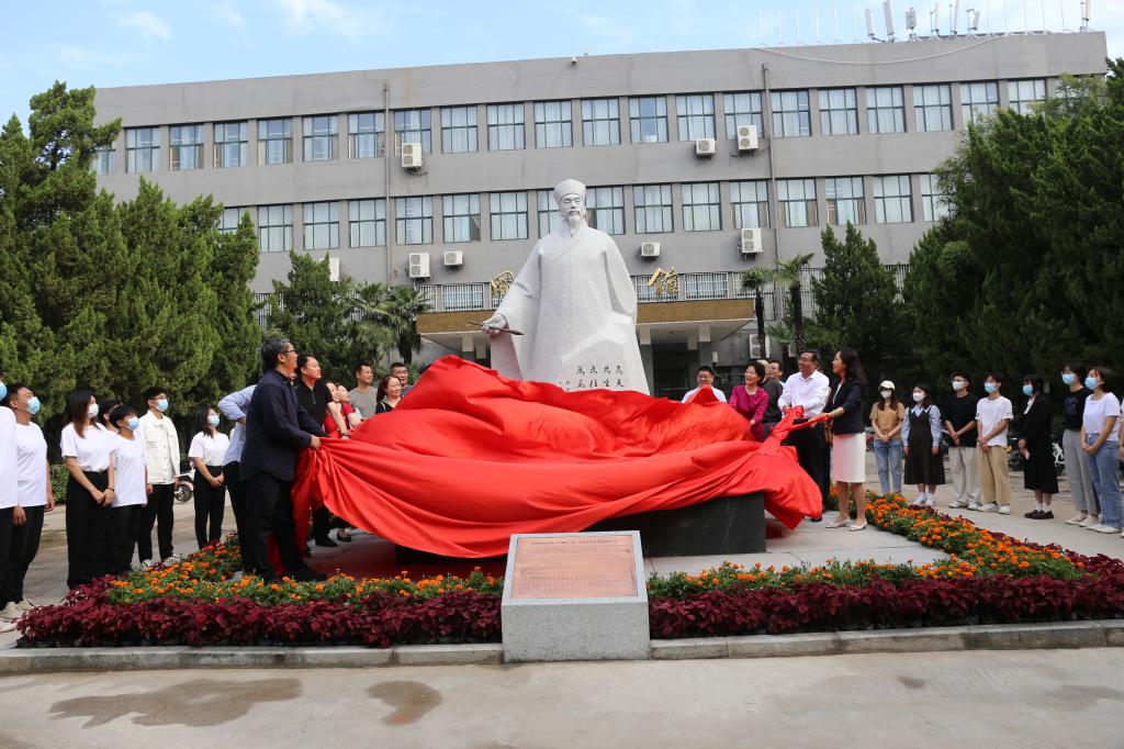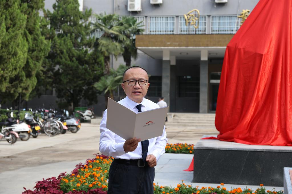 9月22日上午,美术学院2004届校友捐赠张载雕像揭幕仪式在河南大学明伦校区图书馆南门前举行。河南大学党委常委、副校长谭贞,河南大学原校长宋纯鹏,艺术学院原院长赵振乾,河南大学校友总会、教育发展基金会秘书长刘波,总务处处长、后勤集团总公司总经理黄备荒,数学与统计学院党委书记史富强,后勤集团总公司党委副书记杜保明,美术学院党委书记杨江涛、党委副书记周青、副院长蔡玉硕,刘泮峒、李东君、刘阳等师生代表以及美术学院2004届校友代表王洪坤、强永根、安晨光、朱俊宝、梅超、王坤、陶宗晓、吴航、李冬薇、郭滢、沙莎参加了揭幕仪式。美术学院院长席卫权主持仪式。 活动仪式上,谭贞、宋纯鹏、赵振乾、刘波、黄备荒、杨江涛、席卫权等领导师长与梅超、王洪坤等校友代表共同为张载雕像揭幕。 陶宗晓代表美术学院2004届校友发言,他动情地回忆起在母校生活的点点滴滴,表达了对母校的感恩之心。他表示,在母校110周年华诞之际,美术学院2004届校友十分荣幸能够以张载雕像献礼母校,也真诚祝福所有河大学子,在“横渠先生”雕像下潜心学习,奋力向前,再创佳绩。 王洪坤分享了张载雕像的创作理念和过程。他谈到,创作团队历时半年,大家怀着对母校的感恩之情、对横渠先生的敬仰之意和为艺术负责之心,创作出了张载的豪迈气魄和如山般挺拔的形象。雕塑前方由恩师赵振乾所提写的“横渠四句”厚重深沉,与张载像所传递出的宏伟精神相呼应。 杨江涛代表美术学院向始终关注学院发展与建设的领导老师以及校友们表示衷心的感谢。他说,美术学院是具有良好传承和深厚底蕴的专业学院,以其鲜明的独特性,培养了逾万名美育人才,涵养了河南这块美术沃土,为社会发展尤其是文化事业做出了突出的贡献。历届校友薪火相传,感恩母校栽培,2004届校友当数其中的优秀代表。张载雕像匠心独运、鼎力玉成,感谢校友们的情怀和付出,为学校带来了生机与活力,也为母院带来了赞誉与荣光,为美术学院2004届校友点赞。 刘波代表学校向捐赠方代表强永根颁发捐赠证书和纪念杯。 谭贞代表学校向美术学院2004届校友们情系母校发展,关心、支持母校建设之举表示感谢。她说,在原校长宋纯鹏的提议下,河南大学教育发展基金会、美术学院与美术学院2004届的广大校友们紧密合作,历时一百三十余天,最终将设想变成现实,成就了这尊矗立在逸夫图书馆前3米多高的花岗岩雕像,成为明伦校区一道新的亮丽的人文景观。谭贞赞扬了张载雕像的恢弘气势,认为其体现了张载“为天地立心,为生民立命,为往圣继绝学,为万世开太平”的精气神,这种精气神也始终鼓舞着百年来的河大师生砥砺奋进。张载雕像凝聚着校友们对母校的拳拳之心,也必将见证河南大学在新百年的蓬勃发展。 仪式结束后,领导嘉宾与各位校友一同在张载像前合影留念并参观校园、校史馆。
