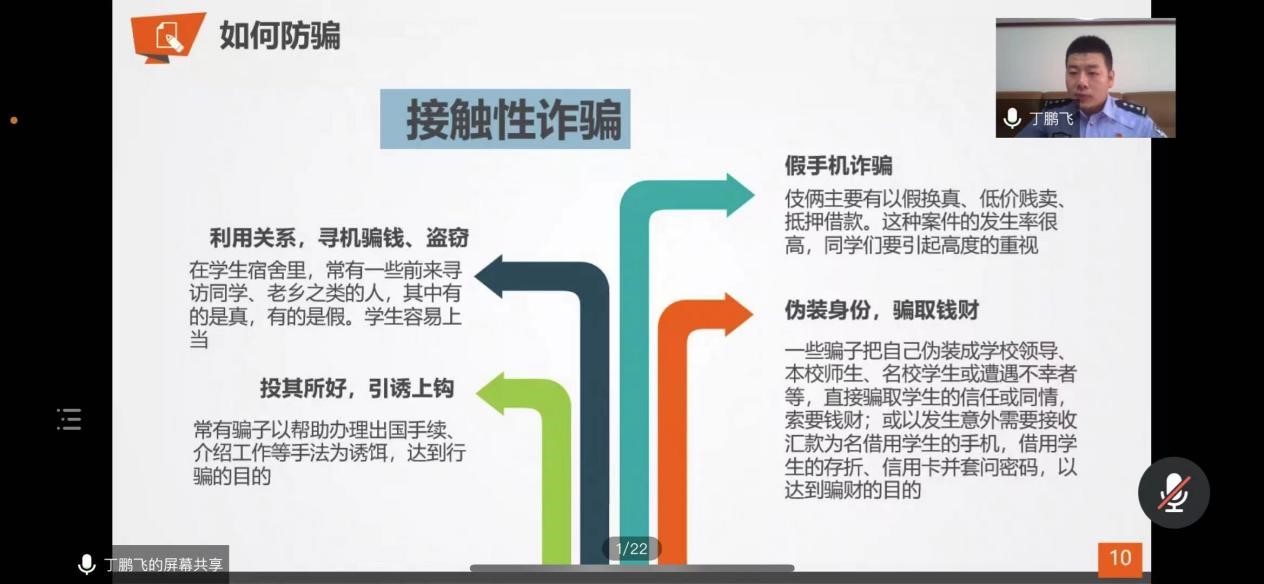 图2:开封市公安局刑侦科队长丁鹏飞通过腾讯会议为学生讲解安全知识。