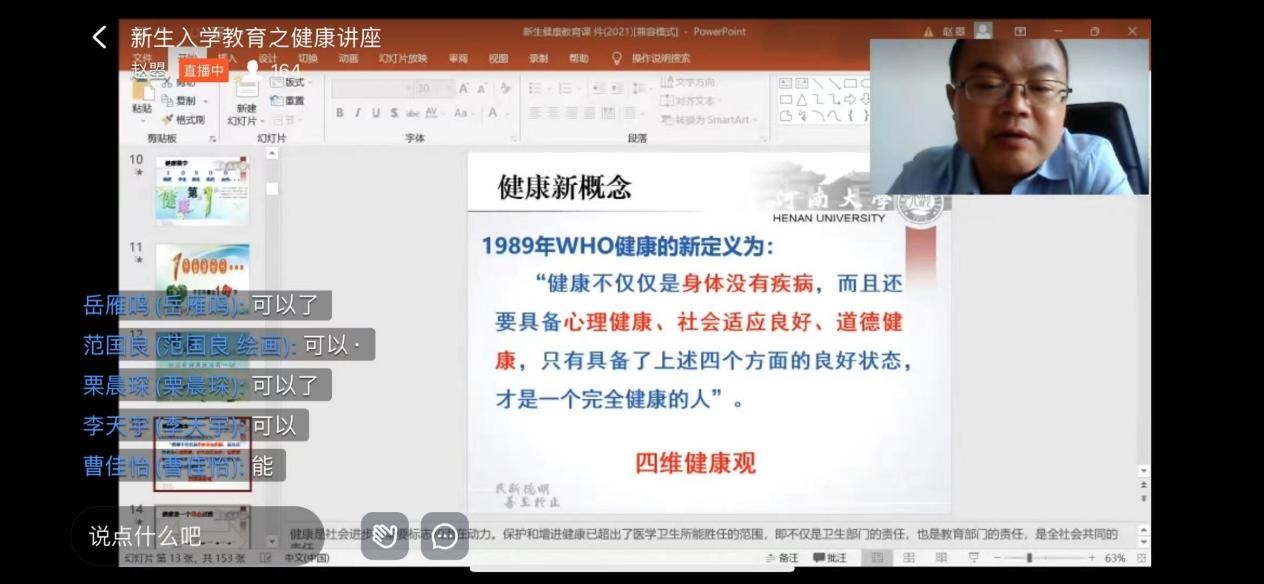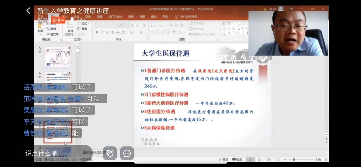 首先,校医院的张书申副院长给大家讲解了日常基础性的健康知识,除了告诉同学们日常疾病的防控方法,和遇到紧急情况的应急处理方法外,还就目前的疫情防控情况给学生们介绍了接下来的防控措施。并介绍了校医院的主要职能,大学生医保的相关待遇和相关的健康新概念。