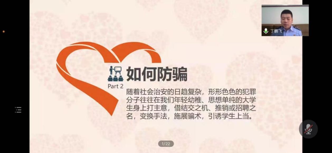 通过此次反诈防骗宣传,丁队长也提出了对大家的期盼,他希望所有同学通过系统的反诈知识学习后,能更加清晰的了解非法分子实施非法活动时通常采用的各种手段,从而做到更好的自我保护。使大家在安全的环境中顺利的度过美好的大学生活。