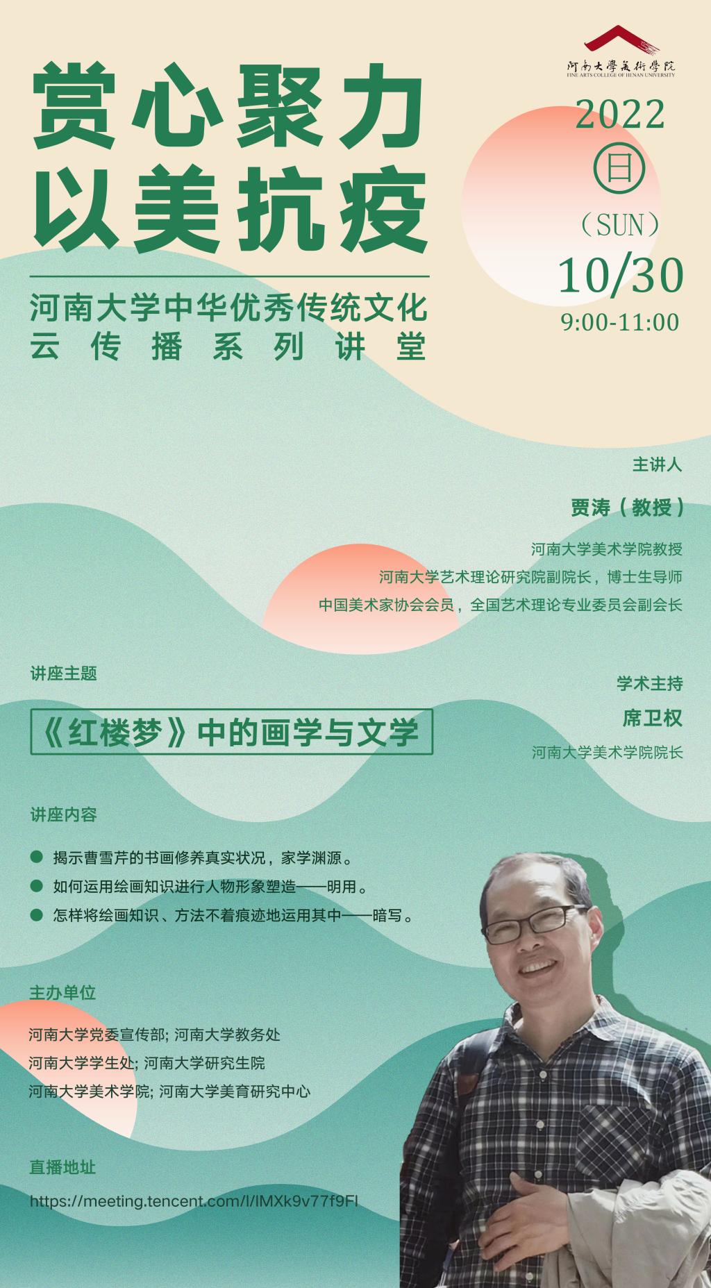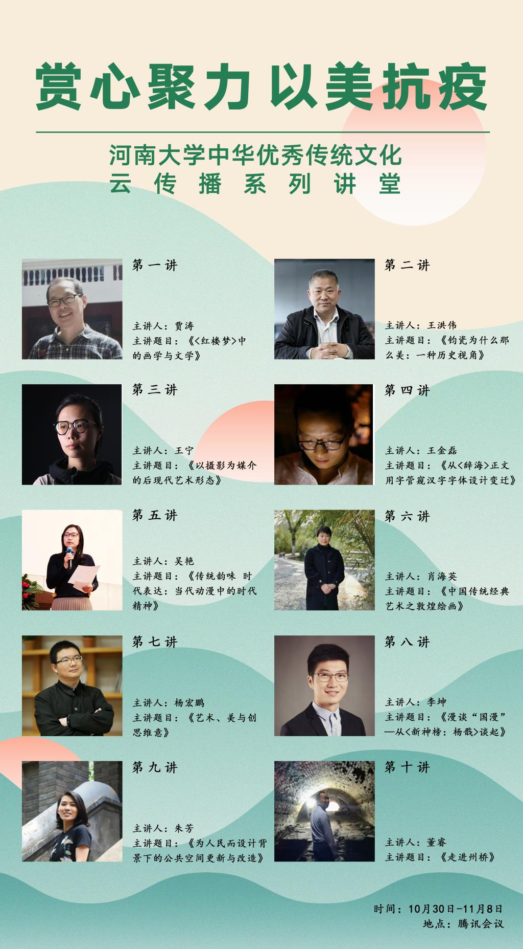 当前,疫情防控工作正处于胶着对垒的关键时期,为筑牢校园疫情防控安全屏障,让学习工作生活早日重回正轨,我们呼吁全校师生,齐心协力,“河”我一起,画出我们最“大”的抗疫同心圆。 疫情无情人有情,“静默”之中大家或许有些许疲惫、些许焦虑、些许迷茫。此时,我们更需要在眼前开启一扇窗,眺望远方,在心中开启一扇门,通达梦想。远处似铁塔风铃在低吟浅唱,或感知一丝不经意的温暖、或动容于文明深处的木铎金声…… 10月29日-11月8日,“赏心聚力、以美抗疫——河南大学中华优秀传统文化云传播系列讲堂”开讲啦!十位河南大学美术学院的老师与“你”相约云端,意会古今,温馨畅神。让我们静下心来,共同开启一场中华优秀传统文化的大美之旅;让我们一起努力,弘扬中华优秀传统文化,铸就社会主义文化新辉煌! 主讲人介绍 第一讲 直播地址: https://meeting.tencent.com/l/lMXk9v77f9Fl 直接点击入会 主办单位: 河南大学党委宣传部 河南大学教务处 河南大学学生处 河南大学研究生院 河南大学美术学院 河南省美育研究中心