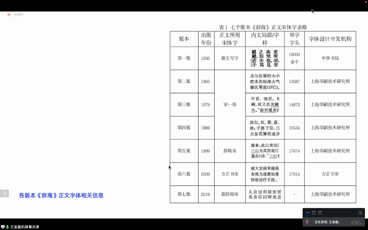 首先,王金磊讲述了《辞海》正文宋体字的发展变化及设计方法。信息技术时代,人们目光所及之处皆可见文字。他通过大量的文献展示了近现代以来汉字印刷字体的魅力,并通过七版《辞海》正文用字的变迁演绎出现代汉字印刷字体的发展脉络:字头数目不断增多,形制不断更新。王金磊称:人们造字如风如水,感受不到它的气息,当我们意识到时,成文已赫然在目。