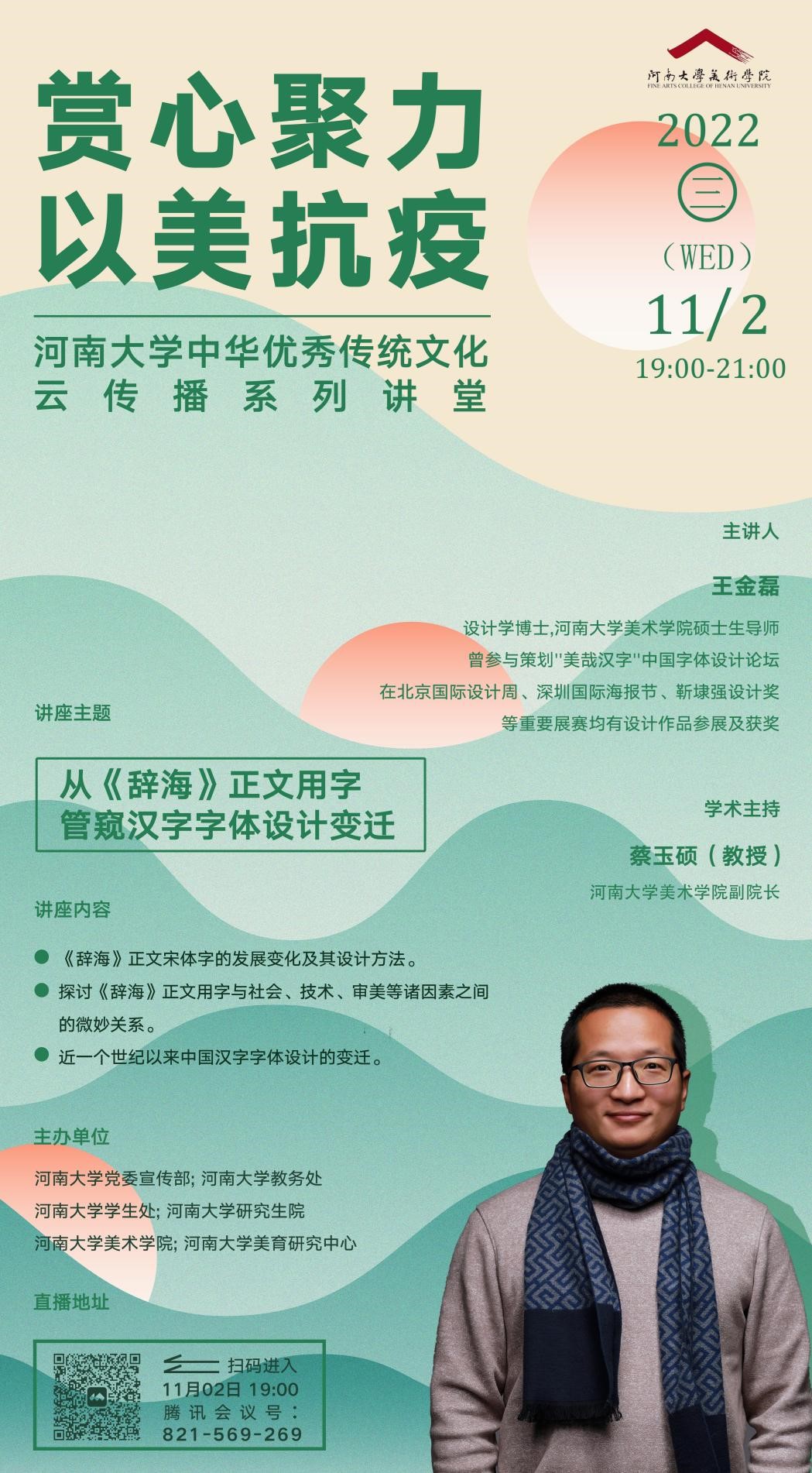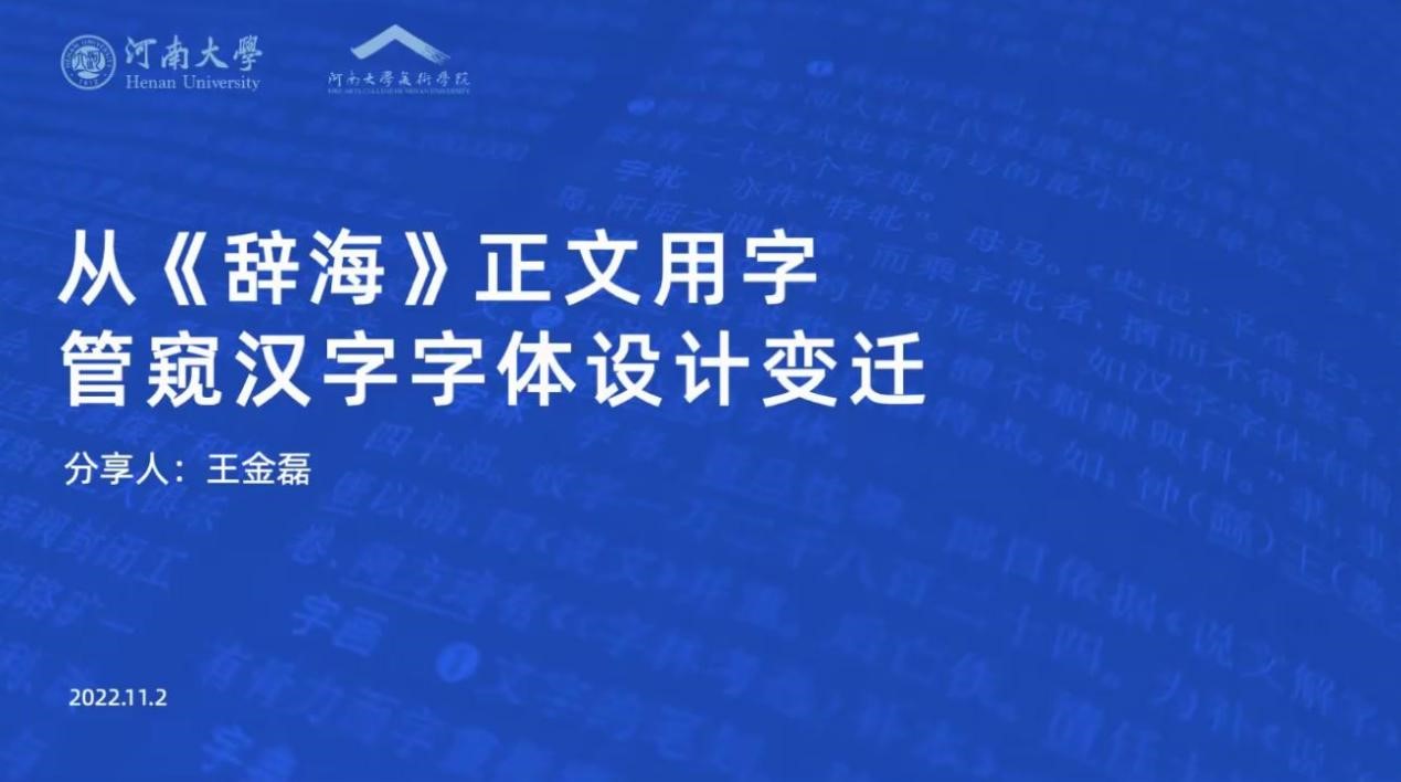 2022年11月2日晚7点,“赏心聚力,以美抗疫——河南大学中华优秀传统文化云传播”系列讲座第四讲,美术学院视觉传达设计专业硕士生导师王金磊副教授主讲的“从《辞海》正文用字管窥汉字字体设计变迁”以腾讯直播方式成功举办。美术学院副院长蔡玉硕教授担任本讲学术主持。