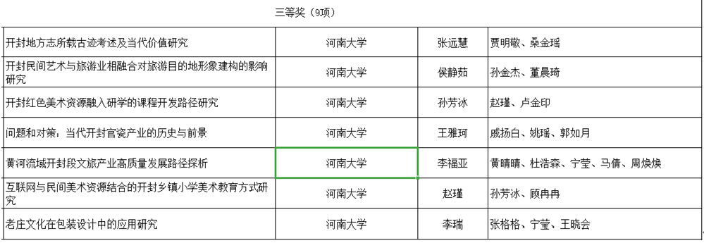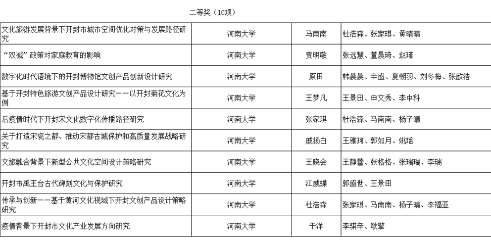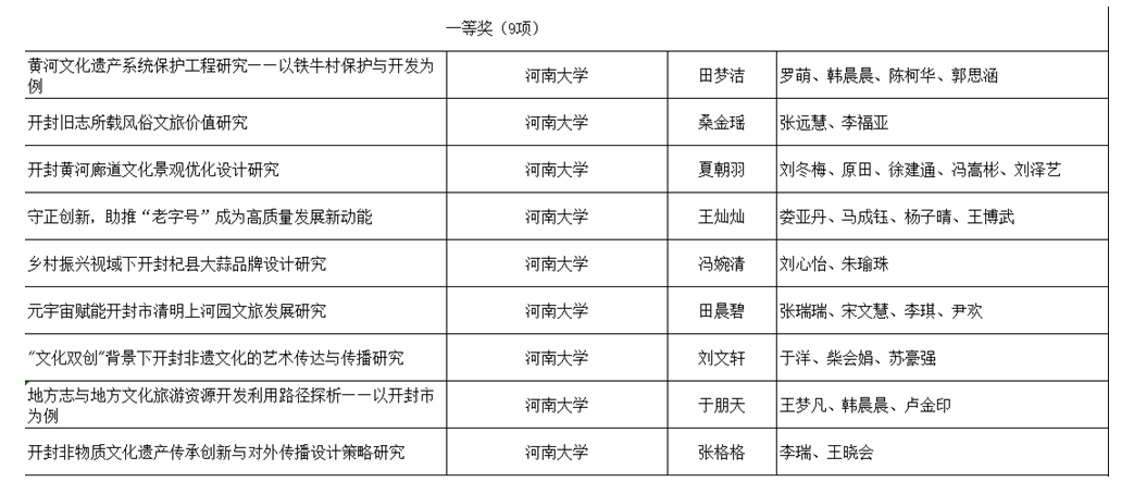 12月13日,开封市哲学社会科学领导小组公布了2022年度开封市哲学社会科学规划调研课题获奖名单。我院研究生申报的课题喜获丰收,共计26项获奖,其中一等奖9项,二等奖10项,三等奖7项。 从获奖课题名称来看,大多数研究均与开封特有的风俗文化与非物质文化遗产相关。研究者多选取与自己专业相关的开封特色文化对象与自己的专业相结合,从艺术传播、文旅开发、景观和产品设计等角度切入研究,充分发挥了美术学院的学科优势。 (一等奖) (二等奖) (三等奖) 在建设中国特色社会主义的历史进程中,哲学社会科学具有不可替代的作用。2022年开封市哲学社会科学项目对于进一步繁荣发展我国哲学社会科学有着重要推进作用,河南大学作为在开封重要科研单位,也是这一系列项目的主力军。美术学院在研究生培养中一直坚持实践与理论并重,重视提升研究生科研水平,培养其学术与现实的结合能力。在这浓厚的学术氛围中,学院研究生与科研办公室积极动员,各位导师热心支持与辅导,研究生尽心完成并提交结项报告。荣获该奖项充分体现出了美术学院研究生培养的优秀成果,也是我院学生科研实力的体现。