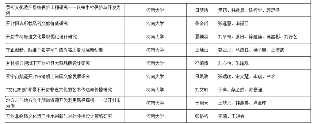 从获奖课题名称来看,大多数研究均与开封特有的风俗文化与非物质文化遗产相关。研究者多选取与自己专业相关的开封特色文化对象与自己的专业相结合,从艺术传播、文旅开发、景观和产品设计等角度切入研究,充分发挥了美术学院的学科优势。